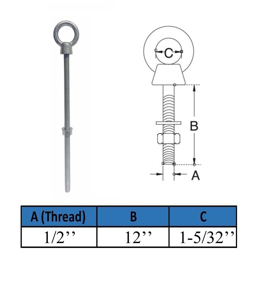 1/2" x 10" Stainless Steel Forge Style Marine Wire Turned Eye Bolt 250 Lb Cap.