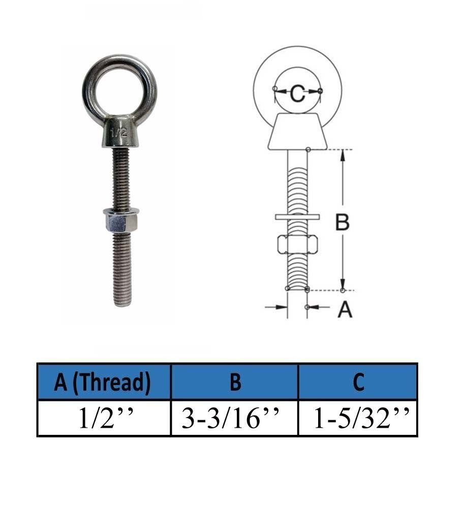 - 4 Pcs Marine T316 Stainless Steel 1/2" x 3-3/16" Shoulder Eye Bolt 2,200 Lbs WLL