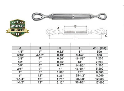 Mil-Spec 316 Stainless Steel Drop Forged 3/8" x 6" EYE EYE Turnbuckle 1200Lb WLL