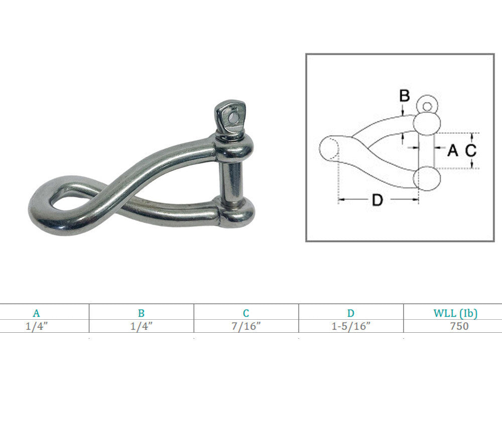 - 1/4" Stainless Steel 316 Twisted Shackle Screw Pin,750 Lb WLL Marine Grade
