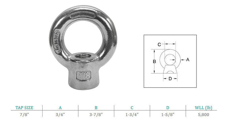 - 7/8" SS316 Lifting Eye Nut Boat Marine With 5,800 Lbs Capacity UNC Tap