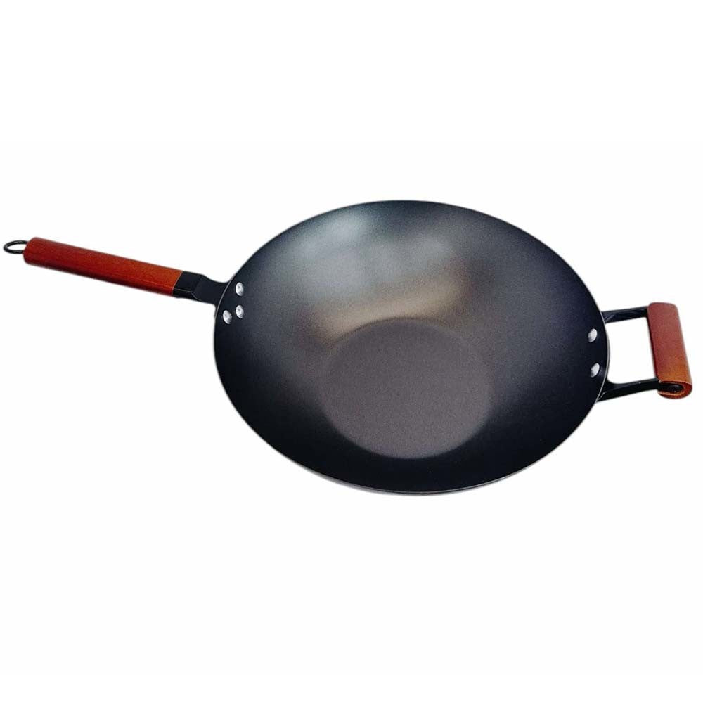 This large wok pan is made from heavy-duty, black carbon steel. The ergonomic design of the wooden handle ensures a comfy grip when you use this pow wok