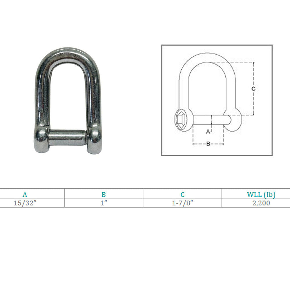 - 15/32" D Shackle Hex Sink Marine Grade Screw Pin 2200 Lb WLL Stainless Steel 316