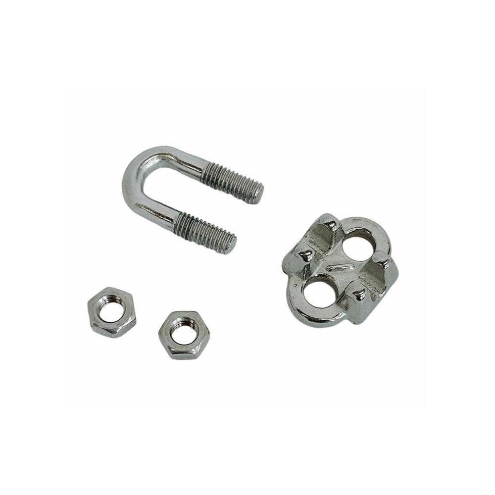 Includes a U shaped bolt, a saddle and 2 nuts, insert the 2 ends of the wire to be fixed into the clamp seat and tighten the nut until it is firm enough to use