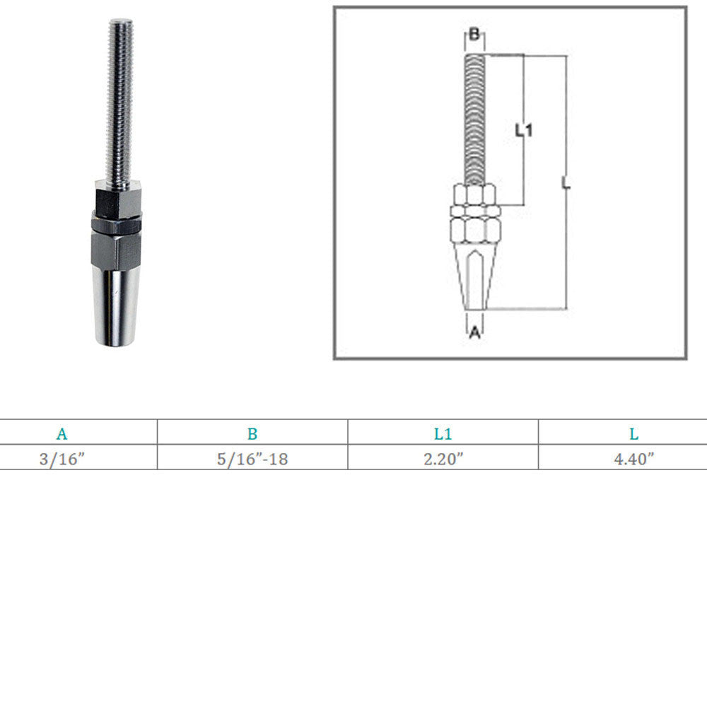 3/16" Swageless Threaded Stud 5/16" Thread 3/16" Cable Stainless Steel 4 Pcs