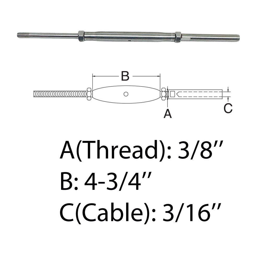 - 3/8" Thread Rod & Swage Stud Turnbuckle 3/16" Cable T316 Stainless Steel T316