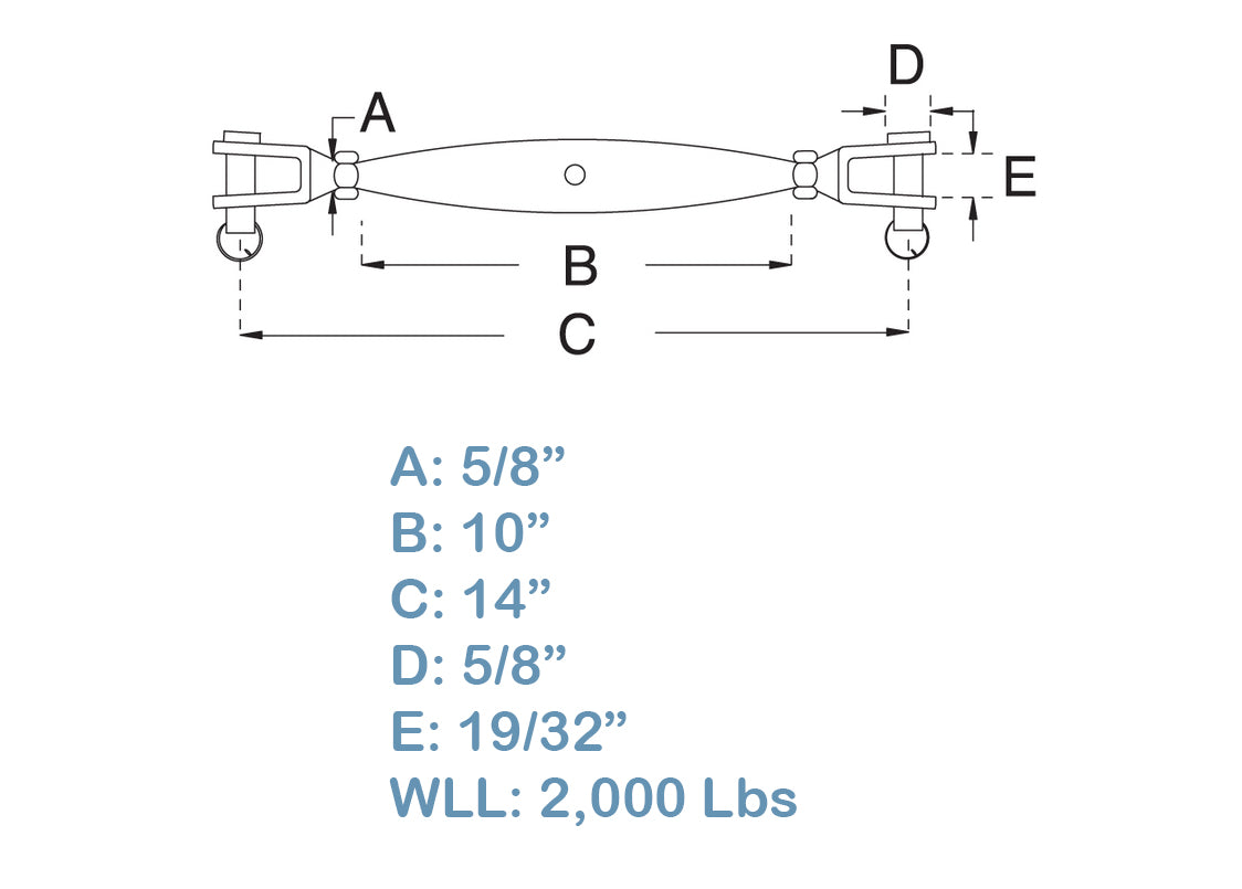 5/8" Stainless Steel 316 Closed Body Jaw Jaw Turnbuckle 2000 LBs Limit 14" Long