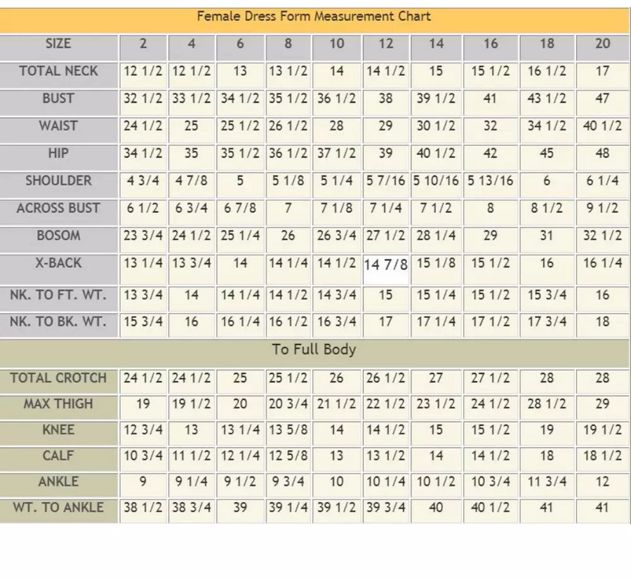 Dress Form Measurement Chart