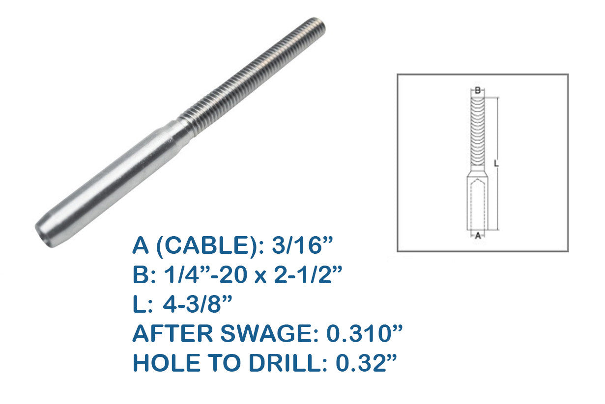 - Marine 3/16" Lifeline Threaded Stud RH Cable Rail Wire Rope T316 Stainless Steel 4Pcs