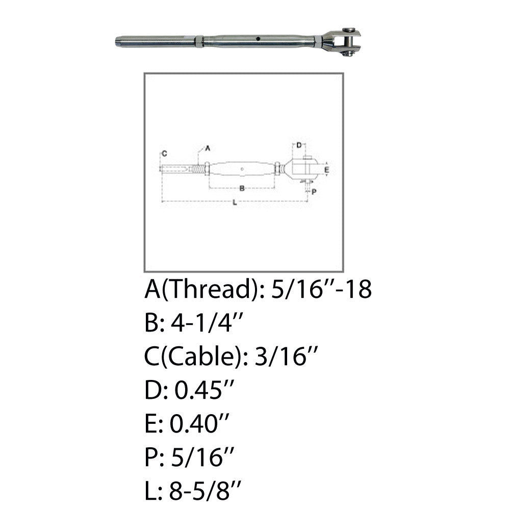- Marine 5/16" Thread Fork & Swage Stud Turnbuckle 3/16" Cable Stainless Steel T316