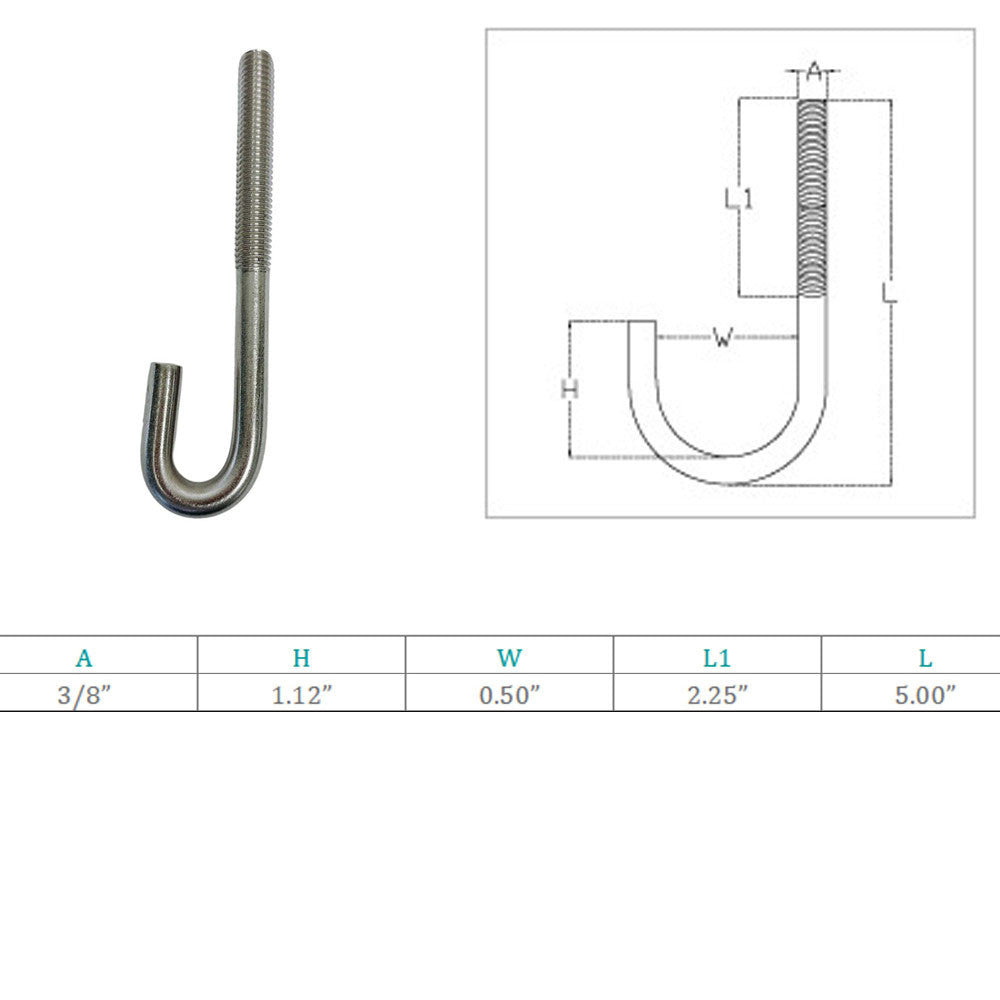 - Marine Boat 3/8" x 5" J Bolt Spring Hook J-Bolt J Hook Stainless Steel T316 4 Pcs