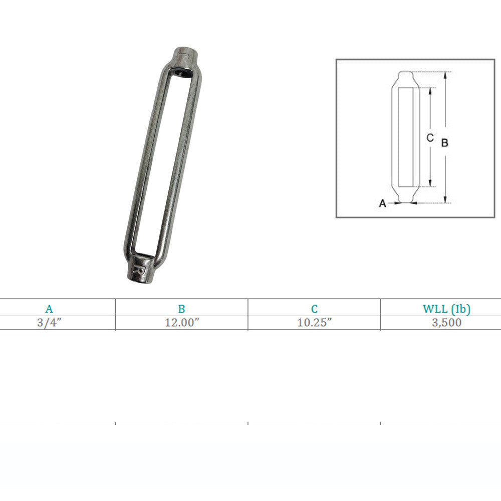 - Marine Grade 3/4" x 10-1/4" Turnbuckle Body 3500 Lbs WLL, Stainless Steel T316