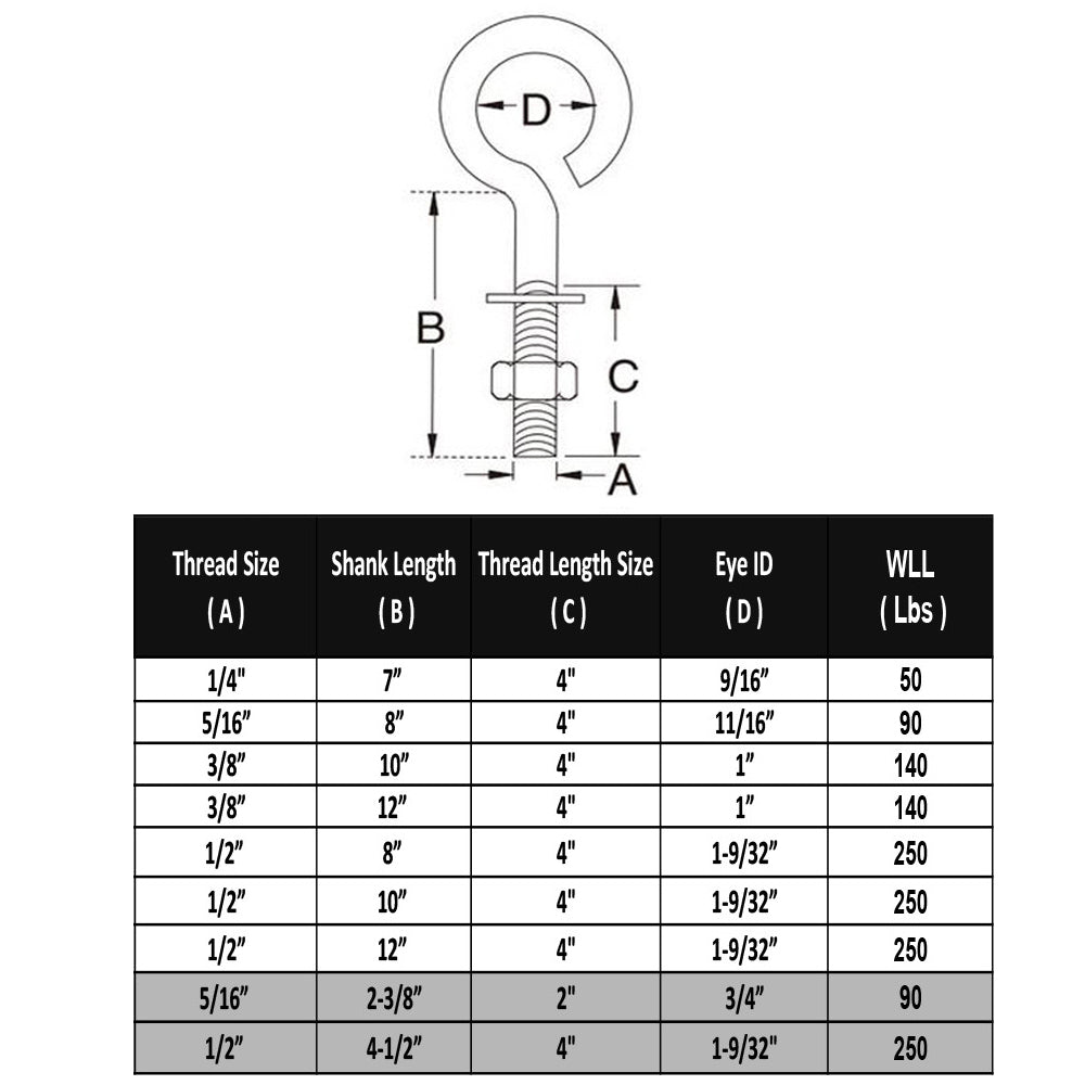 - MARINE GRADE STAINLESS STEEL TURNED EYE BOLT (NUT AND WASHERS INCLUDED)