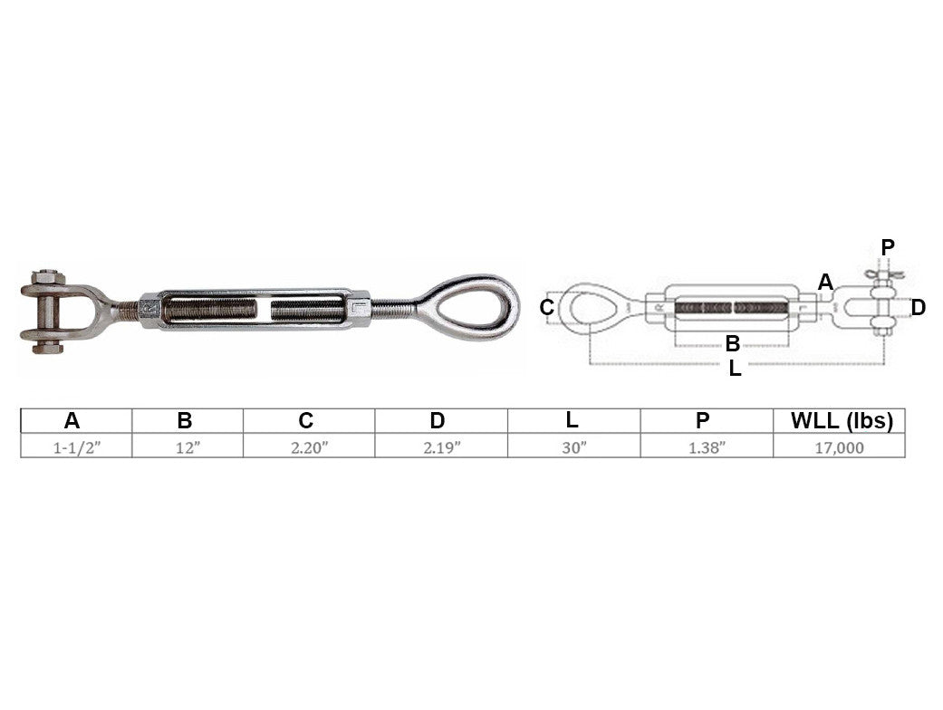 - Mil-spec Drop Forged 1-1/2" x 12" Jaw Eye Turnbuckle 17,000 Lbs WLL Stainless Steel T316