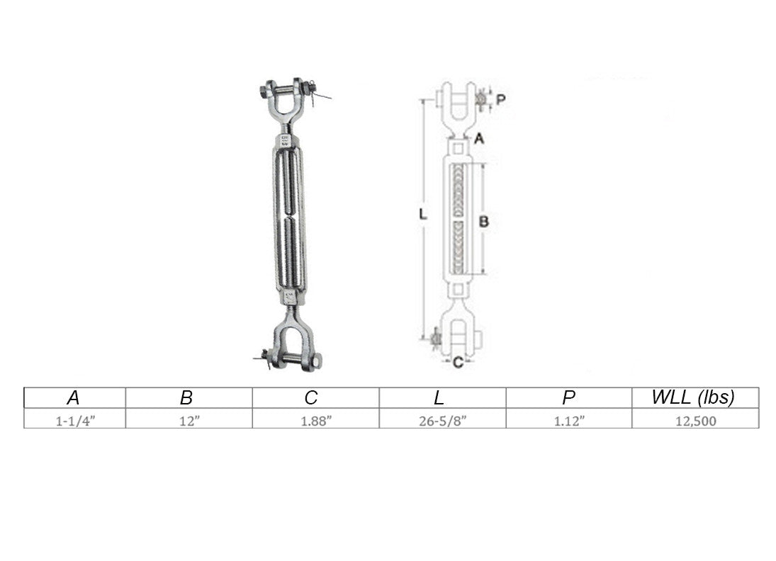 - Mil Spec 1-1/4" x 12" Jaw Jaw Turnbuckle 12,500 Lbs WLL Stainless Steel T316