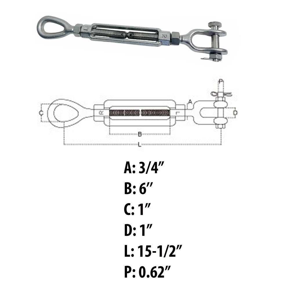- Mil-Spec 3/4" x 6" Jaw & Eye Turnbuckle 5200 Lb WLL Stainless Steel Drop Forged