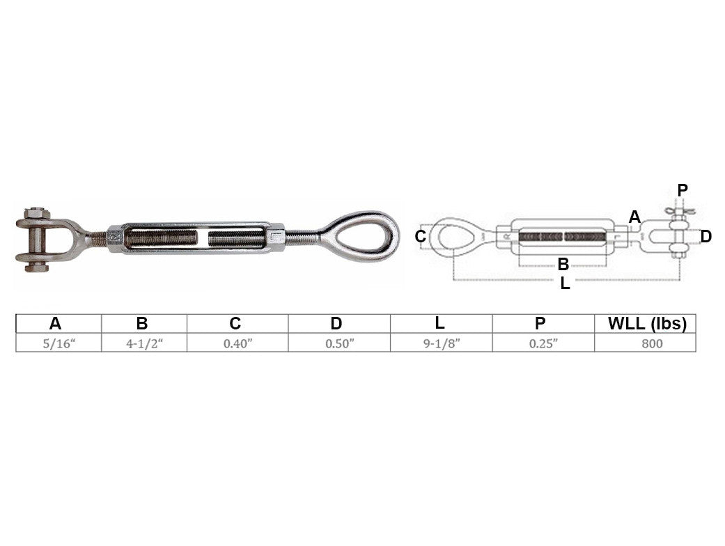 - Mil-spec Drop Forged 5/16" x 4-1/2" Jaw Eye Turnbuckle 800 Lbs WLL Stainless Steel T316